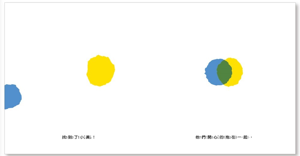 《小藍和小黃》,是一部世人公認的抽象派作品。在這本圖畫書裡,作者完全擯棄了我們常見的具象,用一藍一黃兩個近乎圓形的抽象的色塊,象徵兩個孩子,講述了一個關於愛與融合的故事。