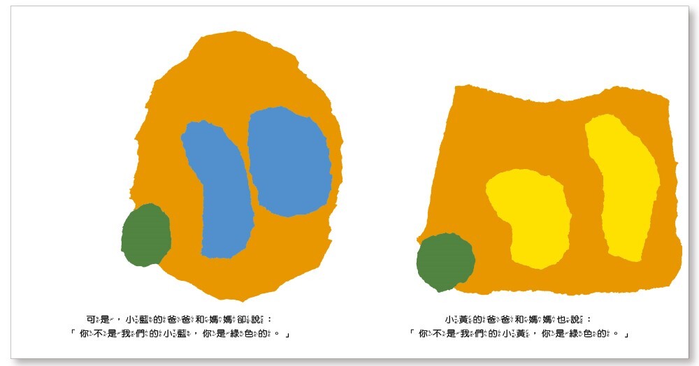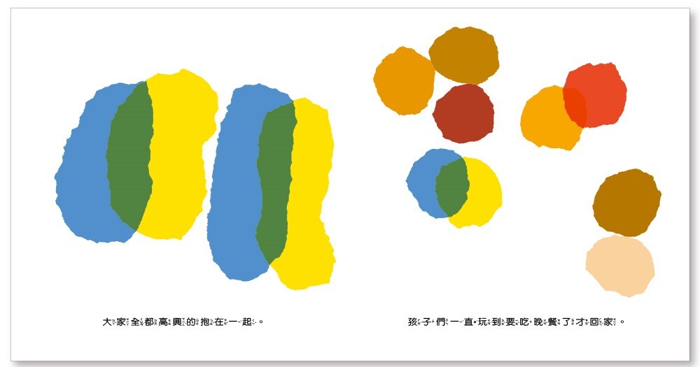 不論是五十多年前的昨天,還是五十多年後的今天,《小藍和小黃》都是一本史無前例、極具創意的圖畫書。所以,自從它問世那天起,就不斷有人憂心忡忡地發出這樣的詰問:“孩子們看得懂這樣的書嗎?”沒有具象,四十多頁的白紙上只有一群五顏六色的色塊滾來滾去,既抽象又晦澀......是的,在外人看來,這實在是一次太大膽、太前衛的實驗了,不,是一次近乎狂野的豪賭,但結果卻恰恰相反,習慣於形象思維的孩子們這一回卻輕而易舉地就接受了這個故事──他們不但讀出了故事,讀出了小藍和小黃的喜怒哀樂,還在小藍和小黃身上找到了自己的影子。或許正是因為抽象,才讓他們更容易產生一種「自我同一化」的感覺吧?