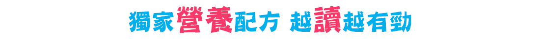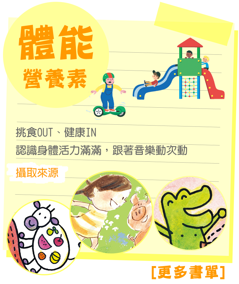 打開悅讀百寶盒,孩子成長中重要的MVP指標六色營養配方,可透過『活力體能營養素、冒險生活營養素、情緒表達營養素、探索遊戲營養素、黑色幽默營養素、思考邏輯營養素』獲得,因孩子的生活經驗有限,其中以親子同樂、共讀為主要獲得途徑,讓閱讀、遊戲就像吃飯,也需要營養均衡。