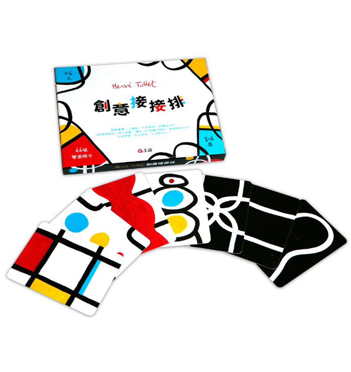 法國插畫家赫威.托雷繼風靡全球的《小黃點》、「小黃點遊戲盒」後,再度推出結合美感與想像的「創意接接排」。裡面有44張由紅、黃、藍、白、黑五種顏色設計而成的雙面圖卡,不僅可以玩接接排遊戲,挑戰小玩家的視覺辨識能力;也可以試著找出同樣花色的牌卡,考驗記憶力;甚至化身創作素材,讓孩子變成小小藝術家,從小培養美感與創造力。