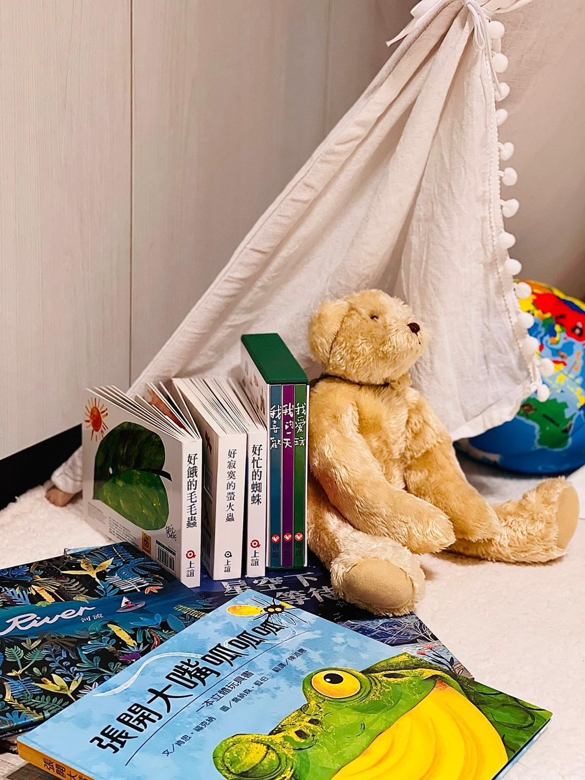 知道女兒對繪本的喜愛後,趁著最近在南部long stay幫她佈置了閱讀的溫馨小角落,擺上幾本適合的書,讓她自由拿取,陪她窩在秘密基地一起閱讀,真是幸福的美好時光。