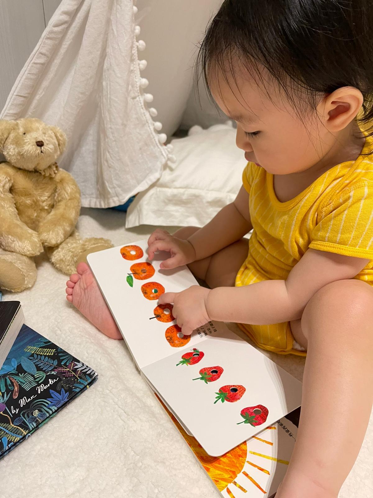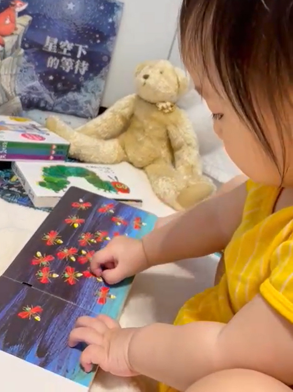 一歲三個月的Jemma學習速度大幅加快,反應與理解在每一次閱讀中都有變化,立體的玩具書與感官遊戲書尤其吸引她的注意,對書中的摺頁,自己能翻閱、摸一摸、去玩、去抓,愛不釋手。