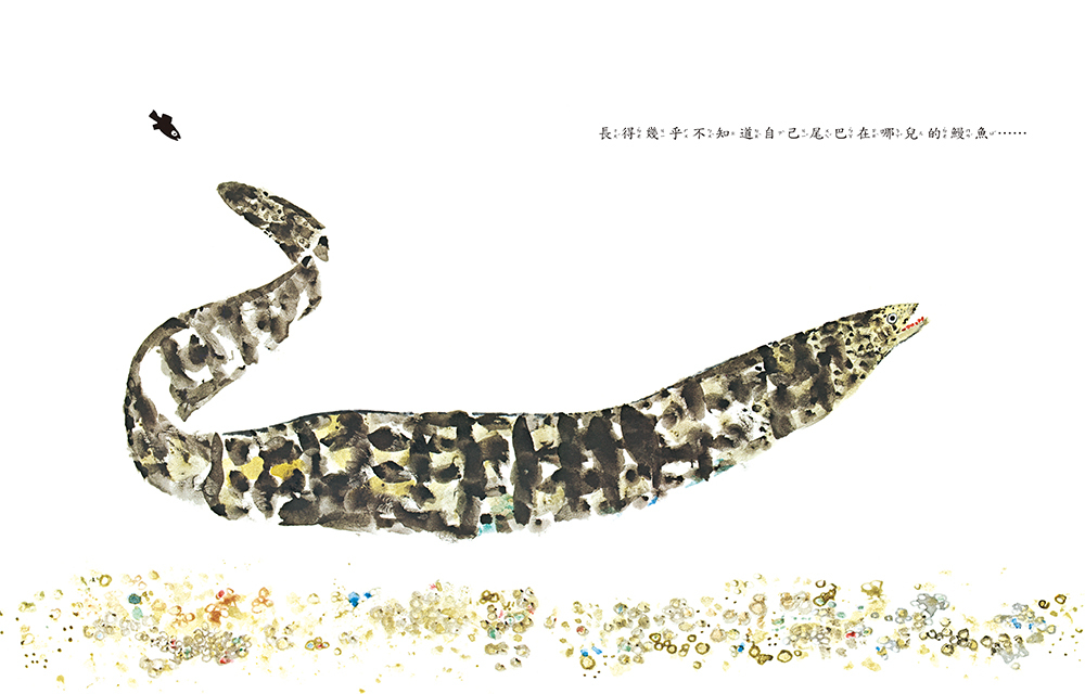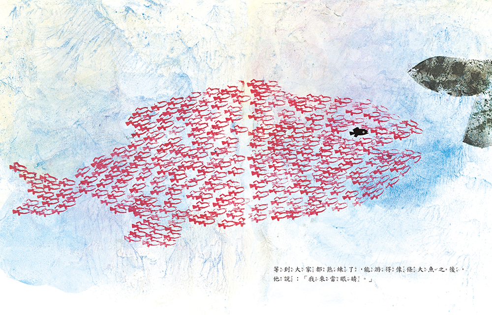 黑黑的小游,讓他顯得與眾不同,也因此逃過一劫,沒有像小紅魚被大鮪魚吃掉,但小游很想和小紅魚,一起悠遊在美麗的海中,不再受大魚威脅…當孩子和小游一樣,開始想、開始思考,就能發揮自己的潛力,更能像小游和小紅魚一樣,團結在一起,以小摶大,解決所面臨的生存問題,享受自由自在的生活。