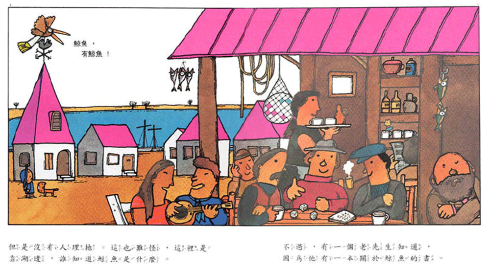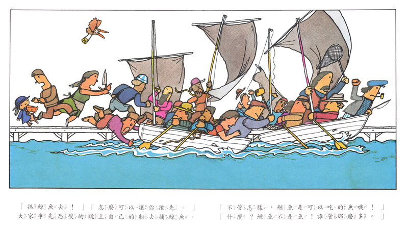 在「鯨魚」這本書中,一隻候鳥傳來看到鯨魚的消息,漁夫們先是興趣缺缺,看了鯨魚圖片之後,根本不管後頭準備作詳細說明的老先生,一夥人就直接往湖邊衝。但因為搞不清楚鯨魚的真面目,所以抓鯨魚的裝備竟是釣竿、木槌、繩子、採集昆蟲的的網子,甚至是隨手抓起的菜刀呢!