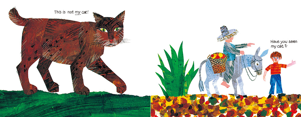 一個小男孩的貓不見了,於是出發去找他的貓。這一路上,他遇見了很多不同國家的人,還有許多同貓科的動物。像是老虎、獅子、或是豹等,但是沒有一隻是他的貓……最後,小男孩終於找到了他的貓,而且還發現了一個驚喜呢!翻開《你看到我的貓嗎?》這本可愛的小書,童書界的拼貼藝術大師艾瑞卡爾將帶領小朋友繞著地球走。他再度運用精簡的文字來說故事,整本書只有「你看到我的貓嗎?」和「這不是我的貓!」這兩個主要的句子,雖然句子一直重覆,但是畫面可沒有閒著,從非洲、中東到亞洲,從獅子、老虎到豹,艾瑞卡爾用五彩繽紛的色紙剪剪貼貼出一趟精彩無比的「萬里尋貓記」。在書中,每一個角色、每一隻動物都不是由單色的色塊所組成的,艾瑞卡爾就是有本事讓這些眼花撩亂、大膽鮮明的圖案相安無事的處在同一個畫面中,成就了呼之欲出的動感。
