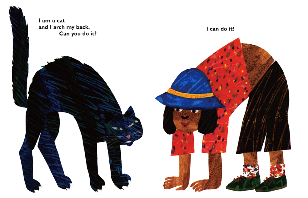 艾瑞.卡爾以鮮豔的彩繪拼貼畫,畫出了十二種不同動物的「招牌動作」,這些動作「從頭頂到腳趾」每一個部位都有,在每一個跨頁的圖畫中,都有一種動物和一個小朋友搭檔,以「我會…,你會嗎?」和「這個我會」的重覆句型,邀請小讀者們轉頭、彎脖子、擺動胳臂或拍拍手,艾瑞卡爾彷彿伸出手來,以他特有的方式對小朋友說:「來和我一起玩吧!」在模仿書中動物的動作時,小朋友不但學會了十二種動物的名稱、十一種身體部位的叫法、以及十一種動作的說法,同時還發展了聽、想像、發現與思考的能力。