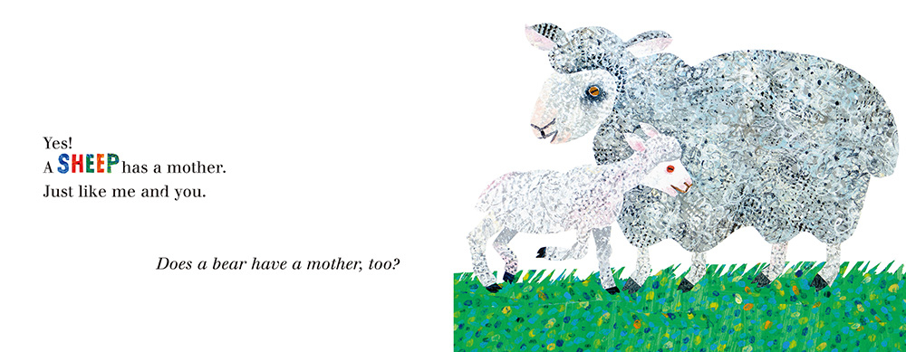 透過艾瑞卡爾五彩繽紛的剪貼畫,我們看到小袋鼠躲在袋鼠媽媽的腹袋裡、小天鵝騎在天鵝媽媽的背上,還有小海豚、小獅子、小綿羊等,每一種小動物都被自己慈愛的母親所呵護。艾瑞卡爾用他的圖畫,為小朋友介紹了十一種可愛動物的外型和迷人的神態,小讀者不但從圖畫中得到視覺上的愉悅,在閱讀的同時,也得到了親情方面的撫慰。