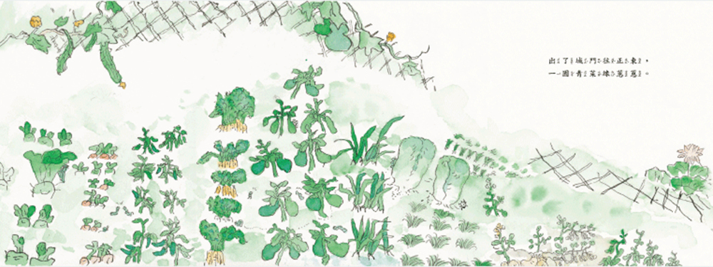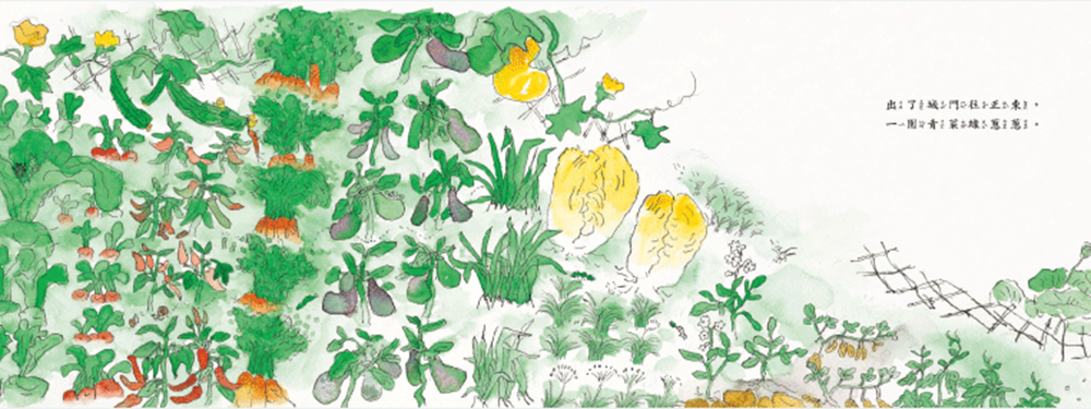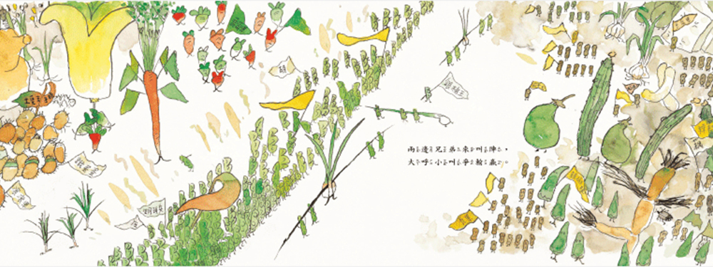 好的童謠需要好的畫面來表現,增一分則太過,減些許就平淡無奇。畫童謠類的作品,一定要走進和它同步的韻味中,丟掉華麗虛假的習氣,踏踏實實浸潤到泥土裡才能相得益彰。翻開書頁,看到青菜蘿蔔們的神氣活現和眉飛色舞,已然開始竊喜著了。畫家遵循著青菜們的獨特個性,又賦予其飽滿的情緒和孩童的頑皮,誇張卻不鬼怪離奇,讓這一群頑童煞有其事的擺開陣勢,抖得暢快淋漓。