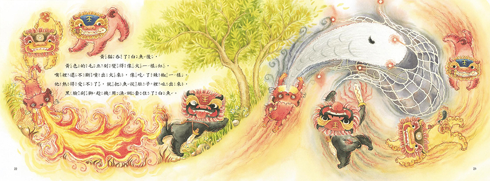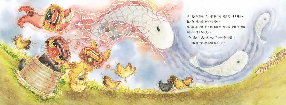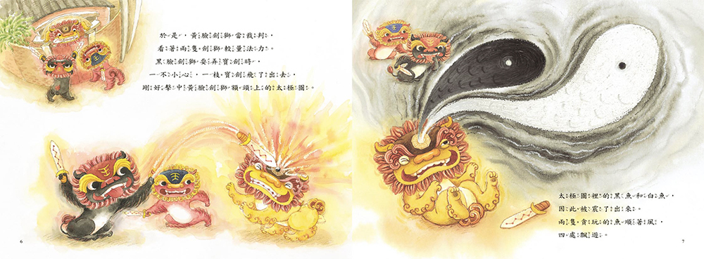 導讀神祕有趣的陰陽太極 文╱劉如桂《劍獅擒魚》是繼《劍獅出巡》後,所製作的系列圖畫書。感謝信誼基金出版社,讓我有機會再為劍獅寫更多的故事。在《劍獅出巡》的故事中,可以看到媽祖、籤詩、我們的生活文化……等,所以劍獅故事的續集編寫,內容也必定會加入與我們生活息息相關的事物。