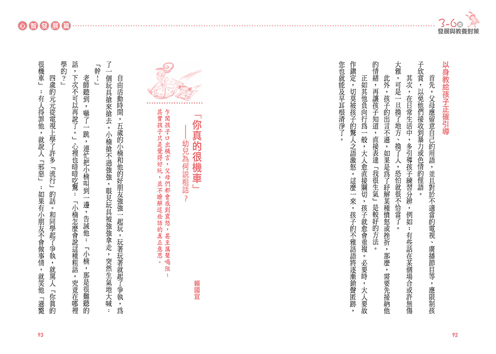 總之,好的知識訊息所提供給我們的,不僅是讓我們「知其然」,還必須是「知其所以然」,讓我們瞭解外在行為之下的內在歷程,讓我們透過環境的刺激,及與孩子的互動,讓他們成為自己潛力所允許的個人。而這系列由《學前教育》月刊專欄集結而成的書籍,提供了父母在知與行上前導架構,在吸收訊息外,還能執行訊息,同時,也讓為人父母的我們懂得在教養孩子的過程中,就像灌溉大樹一樣,觀看及等待我們孩子,慢慢找到方向而成為自己。