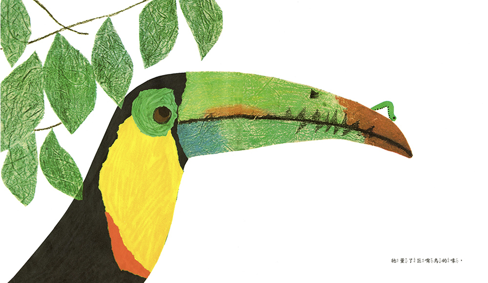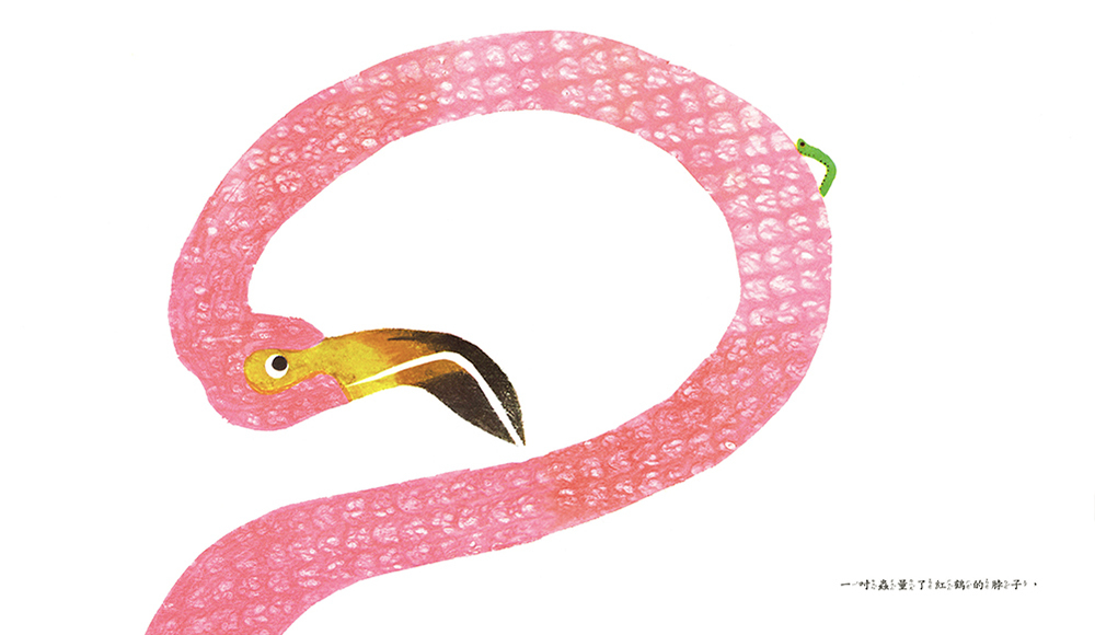 李奧尼畫了一吋蟲爬過紅鶴彎彎的脖子、蒼鷺細長的腳、巨嘴鳥的喙等,圖畫中展現了鳥兒不同的特色。而當那些鳥兒的眼神緊盯著一吋蟲時,你會發現這些圖畫不僅美得令人讚嘆,而且充滿戲劇的張力!
