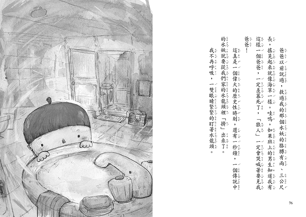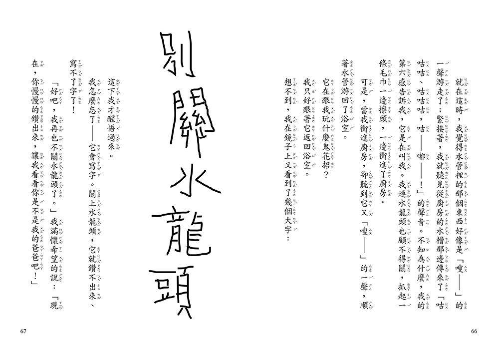 一天晚上,小男孩回家時,傳來了好幾次「咕咕咕、咕咕咕,咕─嘟─!」的聲音,當他到浴室洗手時,鏡子上多出了兩個歪歪扭扭的大字「水蛙」,把他嚇了一跳,到處找來找去,想知道到底是誰寫的字?當他從廚房出來,又發現鏡子上又多了一行字:「別找了,你找不到我」,待他鎮定後,心想:「會不會是變成水妖的爸爸回來看他呢?」