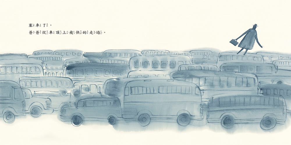 原來這些都是一個孩子在爸爸去上班時,對爸爸上班途中種種的奇幻臆想。灰藍色的筆調,總是看不清楚的爸爸的面貌與表情,表達出爸爸去上班時,孩子心中的掛念與失落。所幸,這樣的失落,透過孩子想像力的轉化,化為一幕幕精彩又獨特的「爸爸上班奇遇記」。