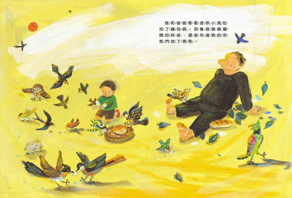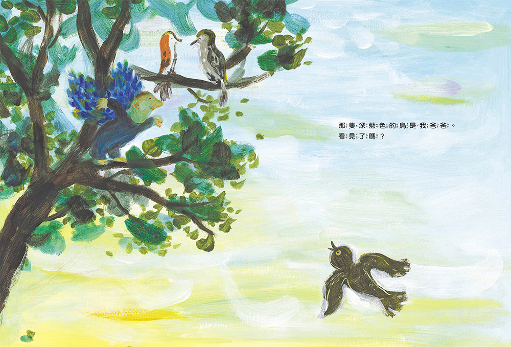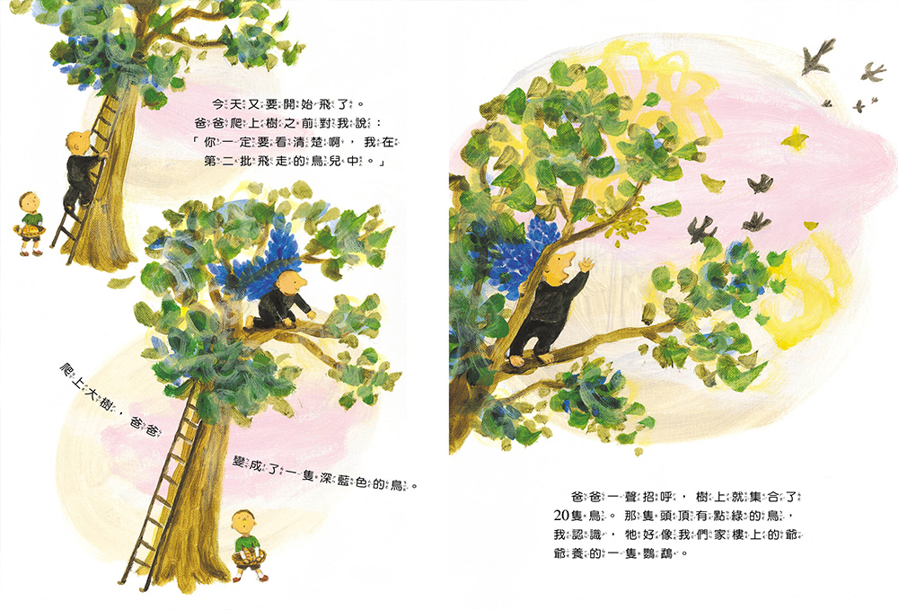 爸爸飛起來有點吃力,可是,爸爸還是堅持要飛…… 為什麼爸爸這麼堅持呢?為什麼爸爸要扮成一隻深藍色的鳥?這真是個好問題,一切的答案都是為了兒子。他和其他的鳥兒一起合作,排出各種不同的隊形,一次、兩次、無數次的飛,不厭其煩的飛,不怕疲累的飛,雖然吃力、氣喘吁吁,爸爸還是堅持要飛……。 「樹上有20隻鳥,第一次飛走5隻,第二次飛走4隻,樹上的鳥比原來少了幾隻?」這個故事從一個孩子的數學功課開始,愛孩子的爸爸,為了教會孩子一道簡單的數學題,用無比的愛心與耐心,把自己當作鳥兒,一遍又一遍為孩子努力的飛翔著,深信孩子一定能夠學會;即使孩子一次又一次的搖頭、聽不懂,但這位爸爸不會火冒三丈、沒有破口大罵,只是慈愛的摸著孩子的頭,堅持要飛。 這一遍又一遍的飛翔,代表著一個父親對孩子濃厚的愛,那麼的溫暖,那麼的令人感動。父親對孩子的一生有著巨大的影響力,包括在性格上、智力發育、興趣愛好等等,因此在孩子的成長過程中,父親不能缺席,現代的父親更應把內心對孩子的關愛表達出來。 作者魏捷藉著故事,闡釋了一個現代父親對孩子樸實卻真誠的愛。希望天底下的父母親,都能夠了解孩子,與孩子快樂的相處,讓孩子能夠感受到父母親的愛,在愛的滋養下生長茁壯。