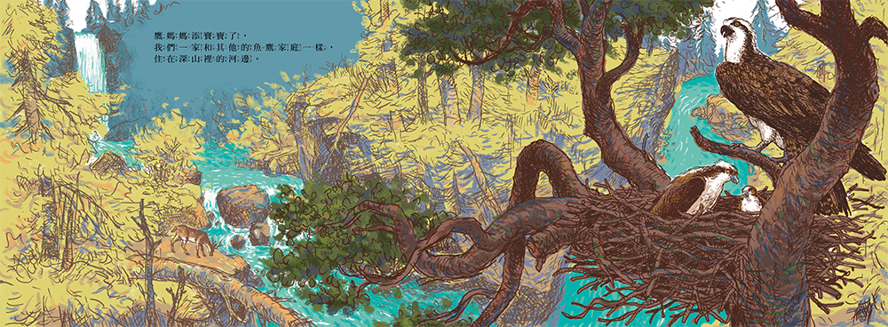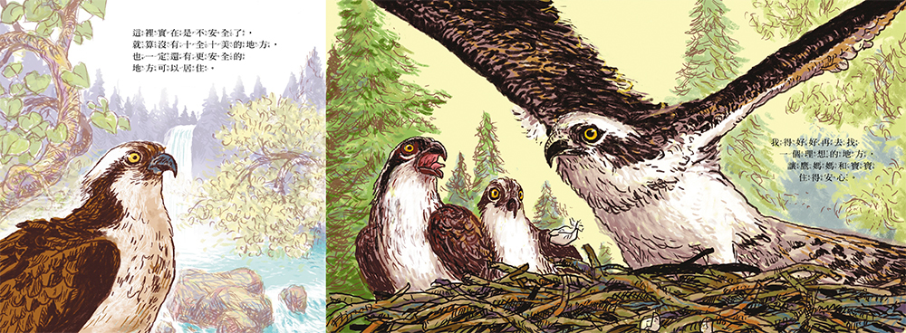 人類與自然共存的美麗家園魚鷹對棲地很挑,築巢地要堅固、居高臨下,還要在魚類豐盛的清澈水域,對污染的水源十分反感,如同許多野生動物,魚鷹也曾經遠離原本的家園、只為了避開有人類的污染地區。當畫家遇見山林鐵橋上的鷹巢、看見魚鷹願意回到鄰近人類的地方築巢,彷彿看到大自然給的微笑,告訴我們:對環境的反思與保育行為,還是有機會彌補人類與野生動物之間長久以來的裂痕。