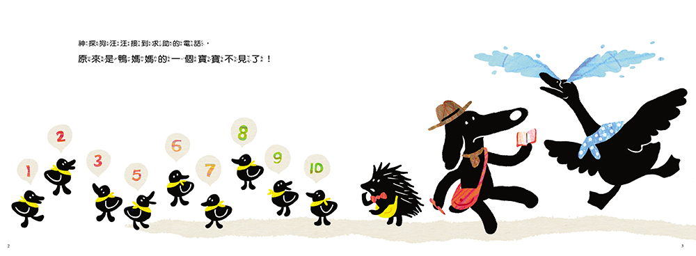 文/宋珮(藝術工作者) 為幼兒製作的數字書或是概念書如果帶有遊戲性質,並由一個簡單的故事串聯,特別能吸引孩子的興趣,讓他們想要反覆與書互動,並在遊戲中學習觀察的技巧與辨識的能力。《神探狗汪汪》這本圖畫書的設計即是以此為目標,不但加入了互動遊戲,還安排了狗偵探和刺蝟助手一起尋找小鴨子的故事串聯情節,親子共讀時,自然會依據作者提供的線索,一頁一頁追蹤下去,在途中能遇到各種有趣的動物與東西,甚至還可以找到一些熟悉的人物角色呢。