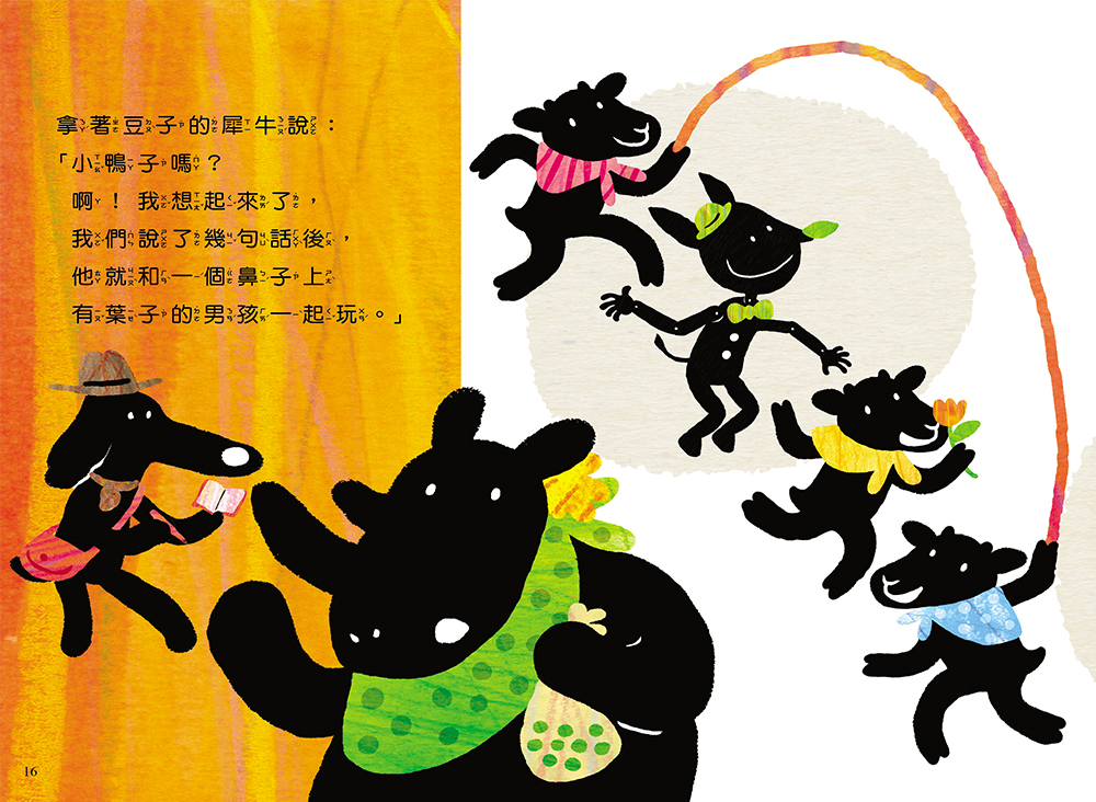 喔?是穿紅色斗篷的?那我們趕快去找。找啊找!找啊找!終於找到了穿紅色斗篷的小兔子,問題是…這件紅色斗篷是小兔子用黃色的壺換來的。這下麻煩了,又得重新找線索了。這本偵探遊戲書,其實是一本視覺辨識遊戲書,同第十八屆信誼幼兒文學獎佳作《小丑‧兔子‧魔術師》一樣有趣。一邊讀故事還要一邊跟著線索尋找人物,觀察每一個細節,和書互動,比如:拿著豆子的犀牛阿姨說:「小鴨子嗎?啊!我想起來了,小鴨子跟我說了幾句話後,就和一個鼻子上有片葉子的孩子一起玩。」