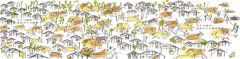 以鉛筆線條搭配粉彩色調,畫家靈活勾勒出了六十六間樓、六十六簍油、六十六頭牛、六十六棵垂楊柳,其樓房井然有序的空間感、油缸層層堆疊的樣貌、牛隻靈活生動的姿態,豐富了畫面誇張、詼諧的數大之美,亦讓讀者在點數當中,發現隱藏其中的精采好戲!