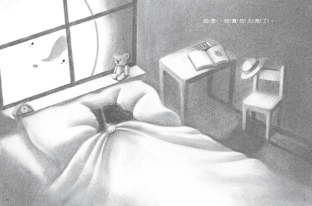 想跟孩子一樣蓋著被子睡覺,但是,月亮太亮了,怎麼辦呢?