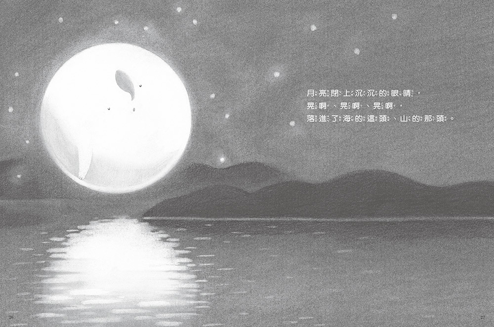 說說這本書的圖畫,畫技、構圖、造型皆成熟,雖然只有黑白的變化,卻溫度不減;月亮飽滿柔和的大球體,給人無敵的親切感,好想把這顆大球抱到床上打滾,表情恰如其分,加了兩隻手增加了戲劇性,也無妨。