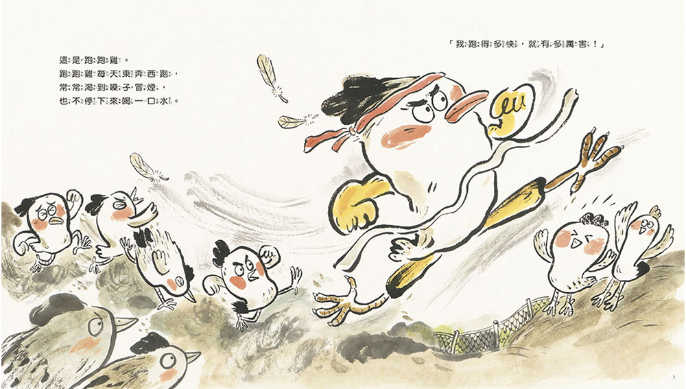 我們回到書裡來講,《溜達雞》是一個恬淡但有溫度的故事,字裡行間透出了自在的意味。作為第二屆信誼圖畫書獎圖畫書文字創作獎佳作,戴芸筆下的溜達雞,在閒步的安然裡,又多了許多孩子氣,牠看小蟲,與小鳥對話,充滿熱情和活力。這是一雙孩子的眼睛在望天望地,望著自然中的所有生命與美麗。在對跑跑雞、跳跳雞和嘰嘰雞的描述上,更讓人忍俊不禁,諧趣幽默的語言讓幾個精力旺盛的角色躍然紙上。