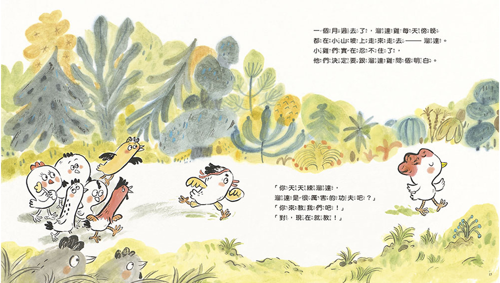 如果看完這本書的爸爸媽媽決定晚飯以後,帶著他們練了一天跑跑功、跳跳功、嘰嘰叫功的「小雞們」出去溜達溜達,那麼我講這個故事,也算是一件有功德的事情了。