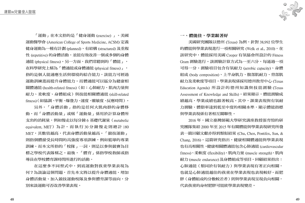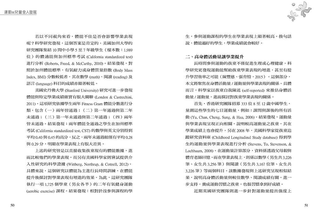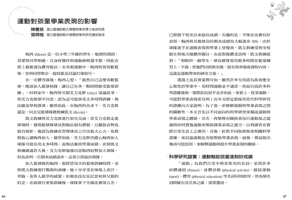 此次配合研討會的執行,特別邀請中央大學認知神經科學研究所洪蘭教授、成功大學運動健康與休閒管理所蔡佳良所長,以及國立臺灣師範大學體育學系張育愷研究講座教授與張教授的博士後研究員陳豐慈先生、台灣大學心理系雷庚玲副教授,分別從「大腦與運動」、「運動影響兒童視知覺和神經認知功能」、「運動與學業表現」及「體能運動的趨勢潮流與研究反省」四個不同的角度,讓讀者可以對「運動與兒童全人發展」有更全面的了解。