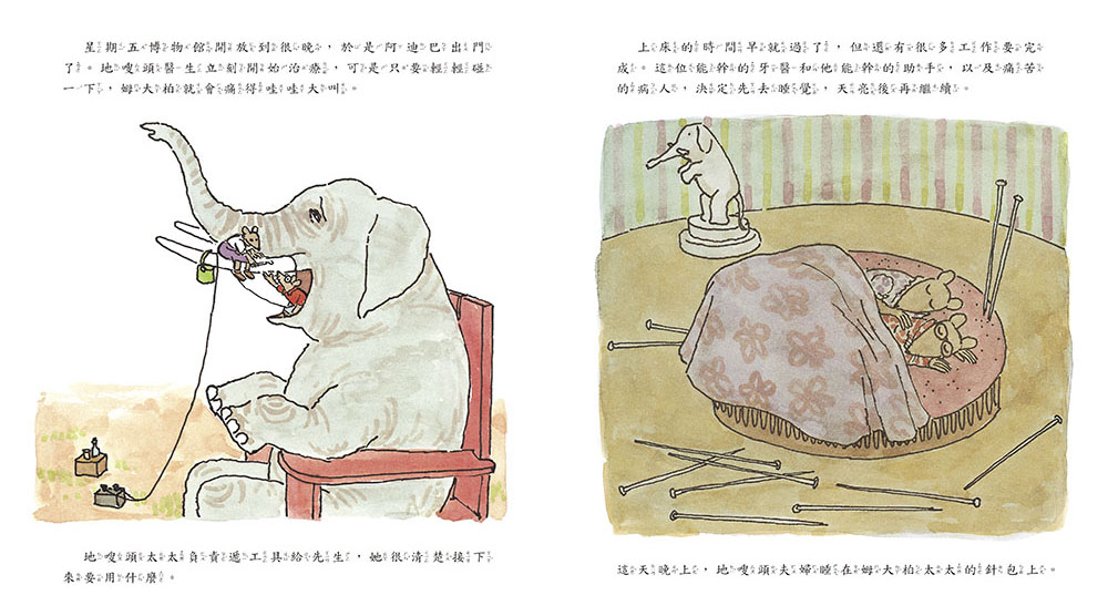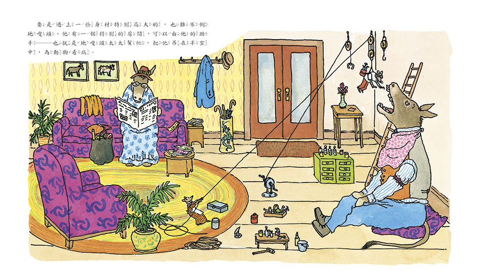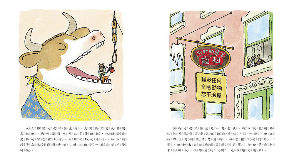 *本書榮獲紐伯瑞銀獎老鼠牙醫地嗖頭的技術非常好,他會爬到梯子上替大一點的動物看牙。要是遇上特別高大的動物,他會請太太用機具把自己吊在半空中,穿上雨鞋,鑽進大動物的嘴巴裡工作。