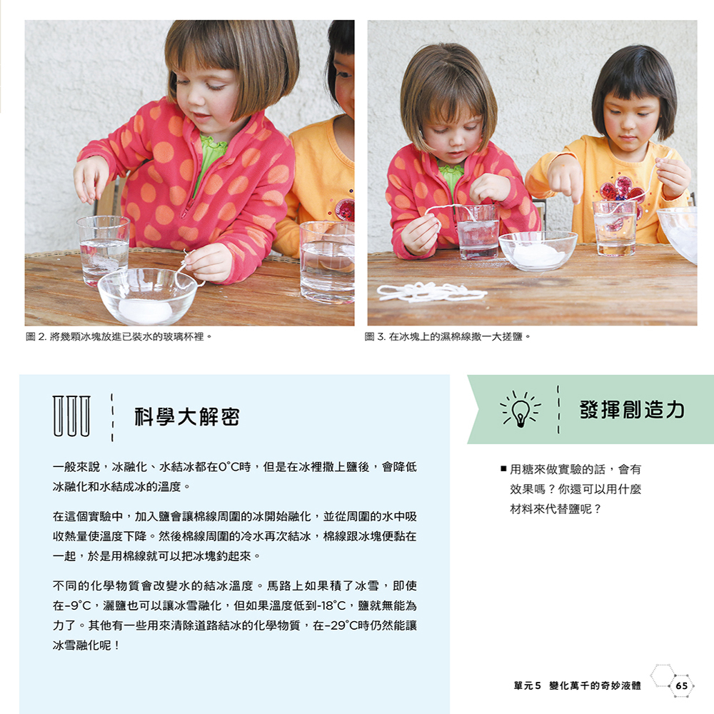 像用白膠、洗衣粉加水,變成有趣、黏呼呼的史萊姆黏土。有別於在臺灣常用膠水加硼砂水溶液,相對的,白膠和洗衣粉取得更方便,一般人在家裡看書後想要立即進行實驗,手腦並用,學習會變得容易許多。再說,書中面對這個變化,每個單元中都有「科學大解密」做深入淺出的解釋:白膠是聚合物,是一長串接連在一起的分子,如同一串珠子項鍊,而硼砂溶液被稱為交聯物質,可以讓白膠的高分子鏈相連。當越來越多的高分子鏈相連、無法移動,於是黏性物變得越來越厚。