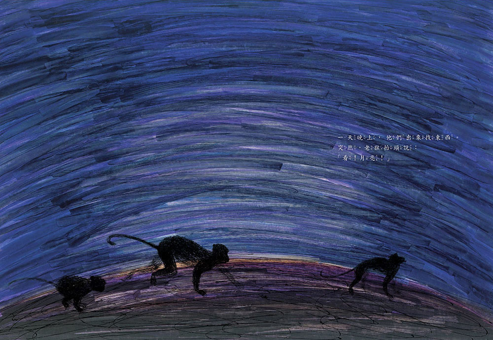 我們打開書頁,第一眼看到的是一個黑乎乎的跨頁。恣意的筆痕、筆觸描繪著茫茫黑夜中樹葉或荒草的斑斑肌理,帶來一片迷濛。書名頁後的連續三個跨頁畫面,也都是山間荒野裡悠悠的夜晚,依稀可辨的是三隻猴子模樣的背影蹲在黑乎乎的山洞裡……