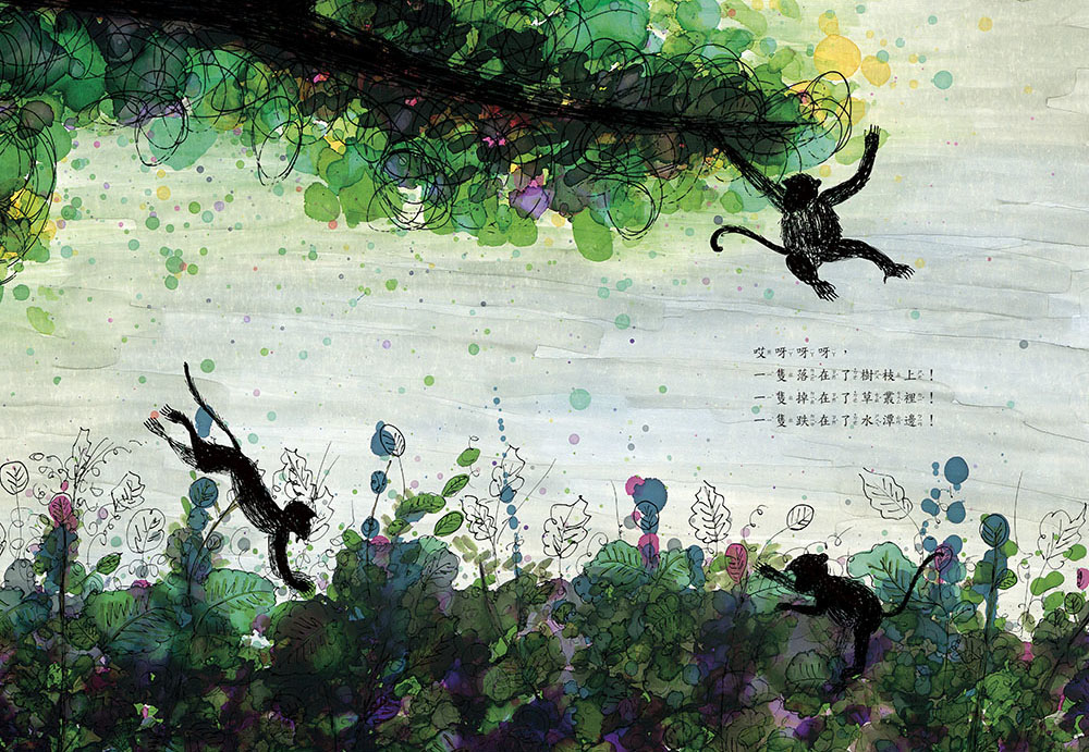 全書的角色只有三隻猴子。作者以剪影的方式描繪三隻猴子,讓人看不清牠們的表情,看不清具體的模樣。毛毛糙糙的筆觸,更多描繪的是猴子肢體的動態。這些動態的變化,傳遞出牠們企盼的心情、趕路的緊張、攀爬的驚險、得月的興奮……一組組的剪影動作演繹了這個故事的歷險情節。