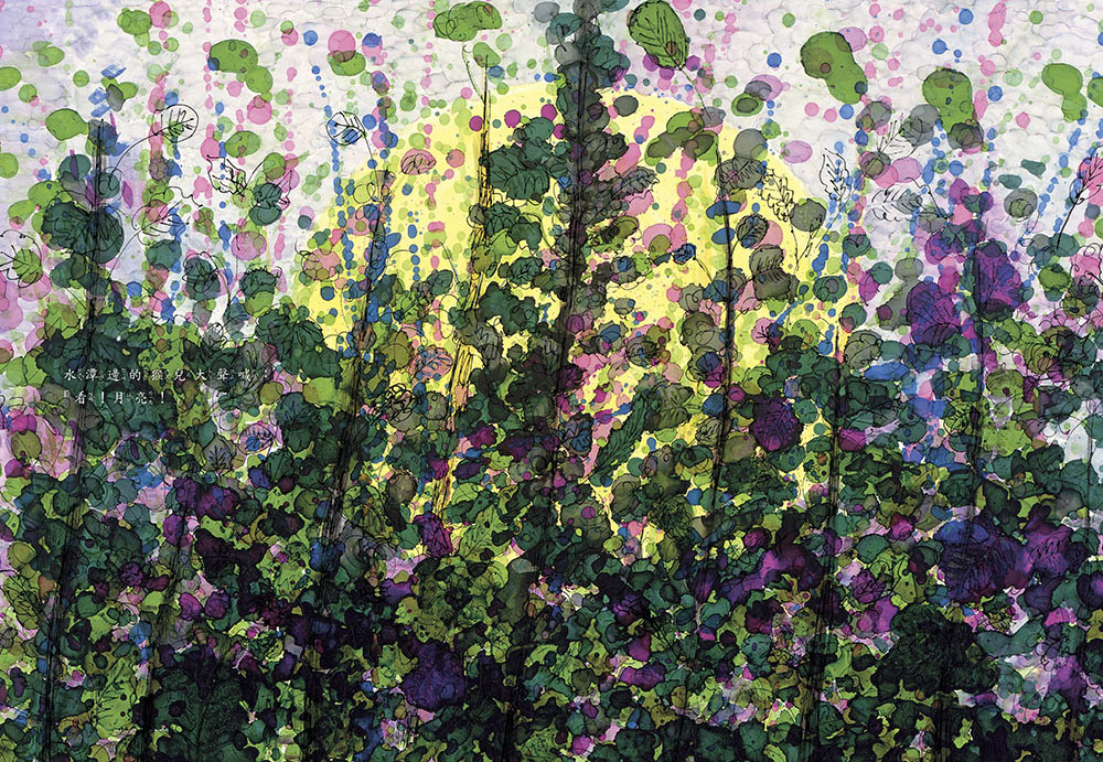 恣意奔放的線條,栩栩如生刻畫出猴子靈動的樣態,寫意大氣的渲染用色,營造出夜晚朦朧迷離的氛圍,豐富的肌理層次,讓每個畫面都有深入其境之感,將我們一塊兒攏入荒野山林之中,跟著猴兒蹦蹦跳跳的摘月去。