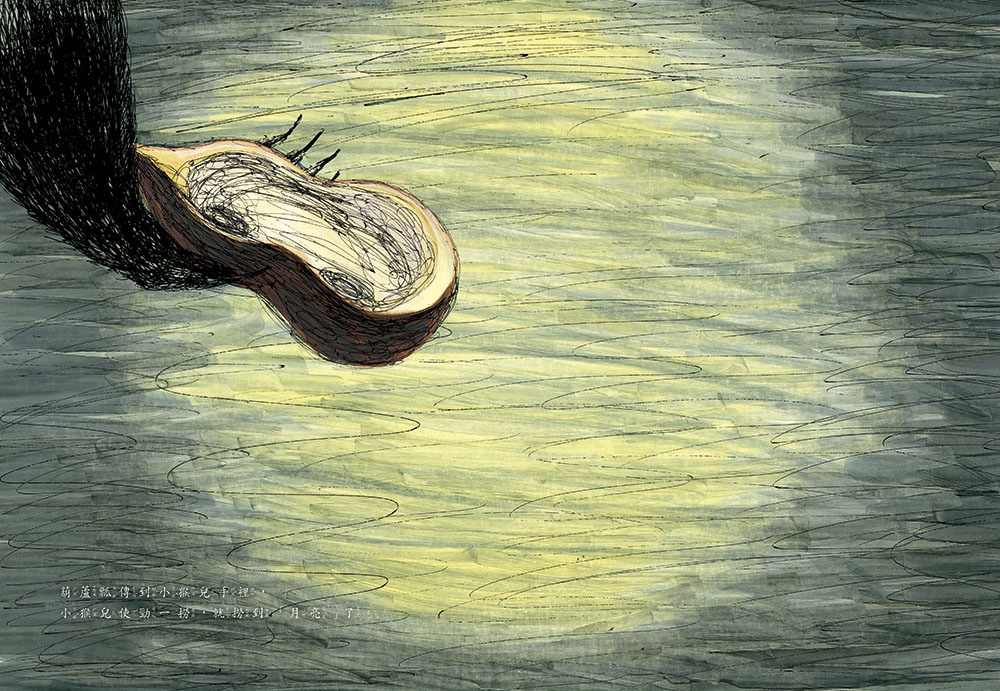 我從沒見過一個「撈月」故事的畫面表現是以這樣一片漆黑作為開頭的。然而,這又何嘗不是在說一個真切而簡單的道理:正是一片漆黑才需要光亮,正是需要光亮才會去「尋找」,也正是因為「尋找」,而產生了行動的方案。三隻猴子開啟了「尋找」的歷程,思維的想像跳了出去。幻覺、臆想、險情、意外,便跌宕跳躍著隨之展開⋯⋯最後,作者給了我們一個大大的特寫。我們終於看到,這個艱辛歷險所撈到的「月亮」,被猴子們寶貝、稀罕的舀進了水瓢中。然而,又因為太高興、太喜歡、太迫切—「月亮」灑了……我們好遺憾,好心疼。