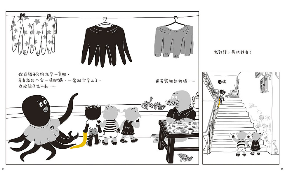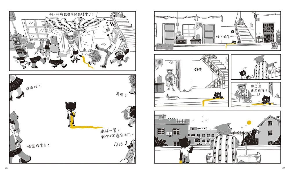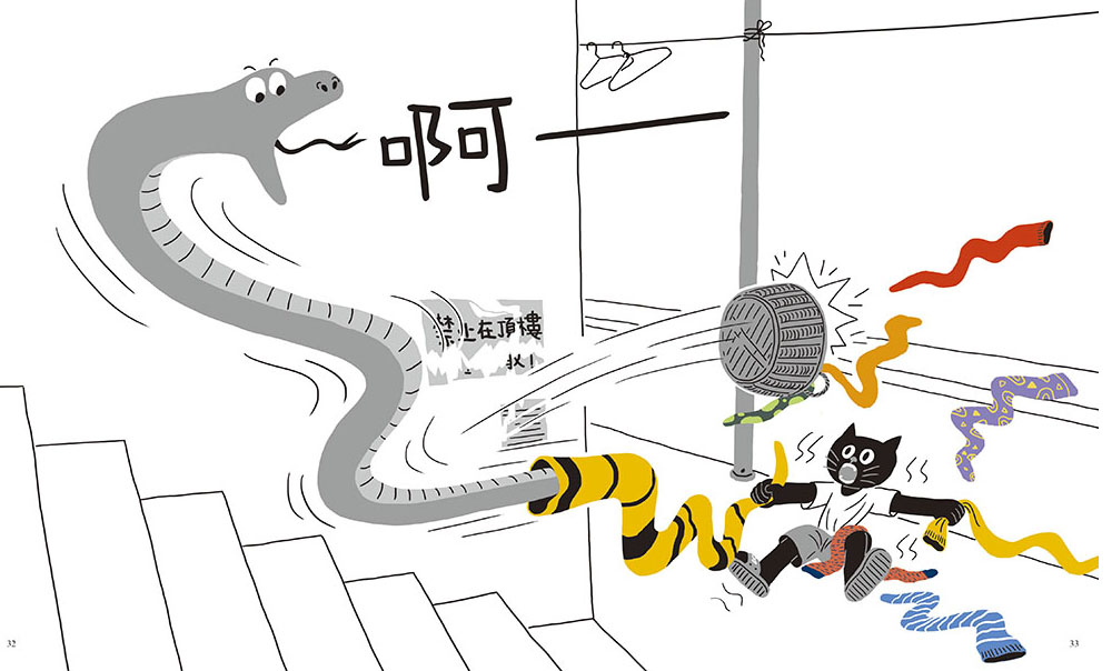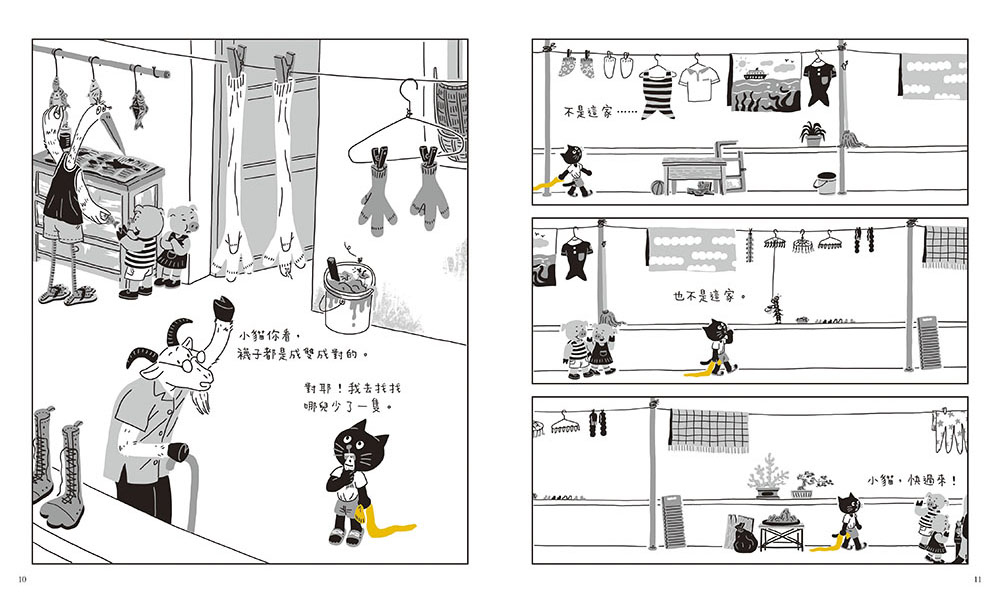 尋找最適合的創作形式我最初是想借小貓送襪子的經歷,串聯起整棟樓裡的眾生相,並能看到小貓在此經歷中的成長變化。但這些想法具體落實到每個情節和角色上,實在是非常考驗人。在反復的修改與反芻中,我希望有一些突破,於是,一個介於漫畫和圖畫書之間的新形式到來了。形式定準以後,我有了更大的發揮空間,很多情節設計開始飽滿起來,角色也慢慢立穩腳跟。