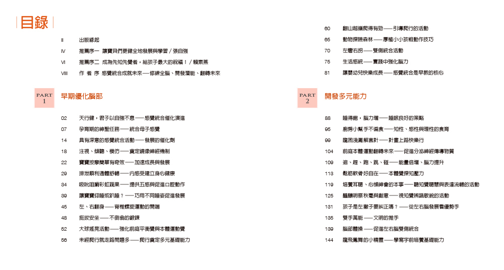 出版緣起掌握孩子發展的先機對嬰幼兒來說,用聽覺、觸覺、視覺、嗅覺、味覺等感官知覺,開始認識花花世界,是最自然不過的,但是有時「感覺」不對勁了,孩子的行為表現就彆扭起來。有很多理論研究都在探討孩子的行為,其中,「感覺統合」學說的興起,讓父母和老師們有了一個全新的角度來觀察孩子、理解及接納孩子,並找出新方法協助孩子成長。