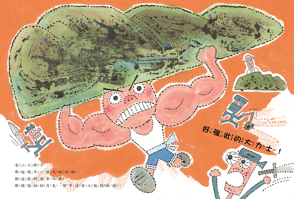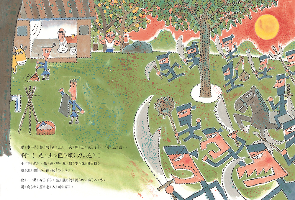 入圍波隆納插畫展的湯姆牛這次透過點畫勾勒人物角色和場景,技法新穎卻又不失他最擅長的造型、構圖等特色,每個空間以及人物表情的描繪更是獨樹一幟,例如透過九宮格的分鏡圖,表現山中歲月的流轉,也同時描繪出三個小孩能力的改變。仔細觀察,還可以發現每一個人物角色的造型和表情差異與逗趣喔!