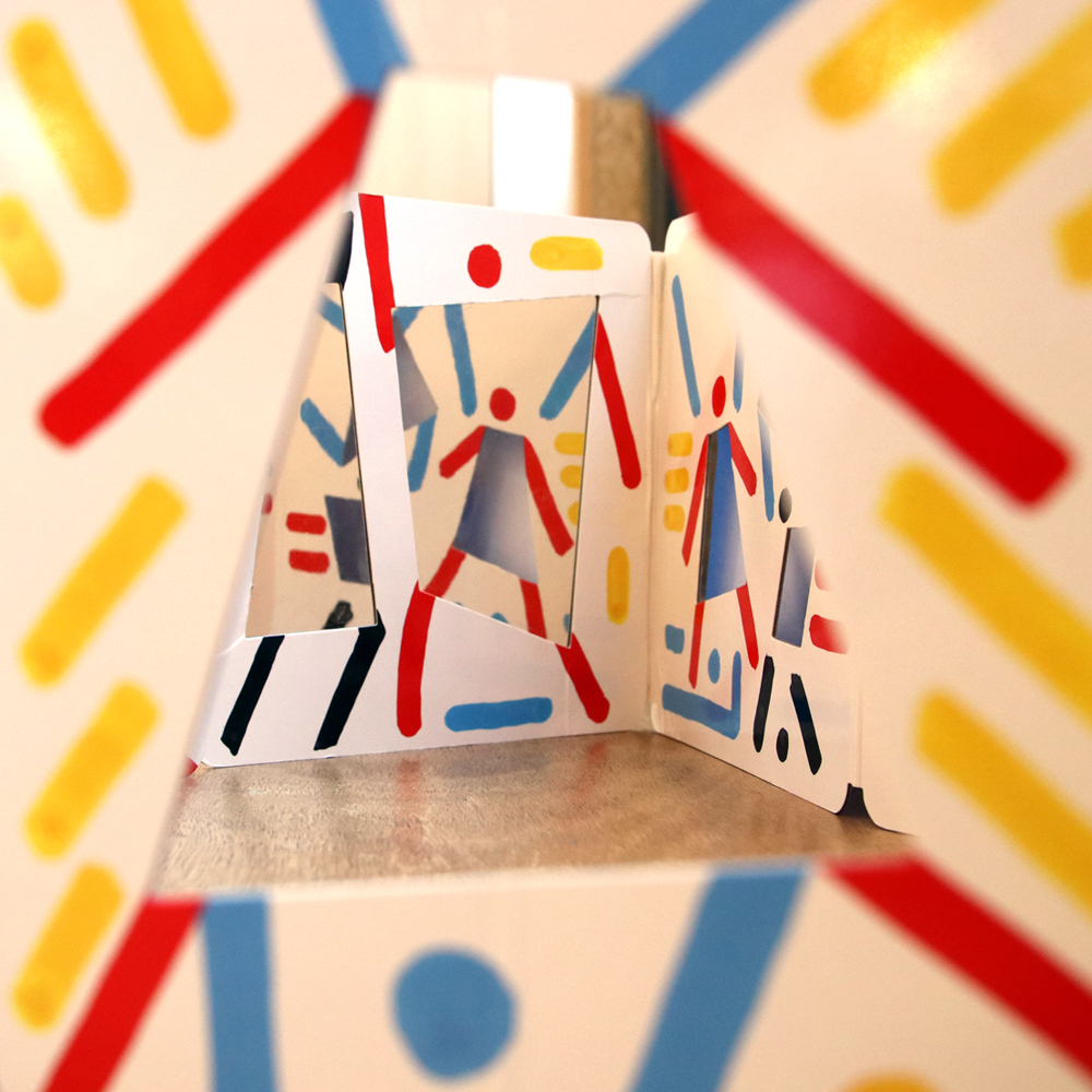 ●視覺遊戲:把這本書圍起來,從不同的洞洞看進去,空間延伸了,透過鏡像你看見幾個人在跳舞呢?