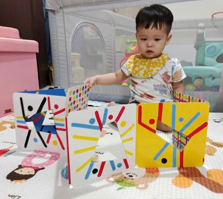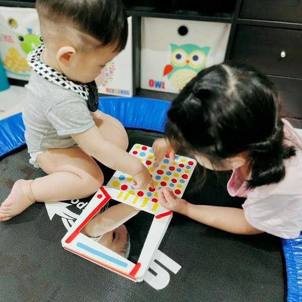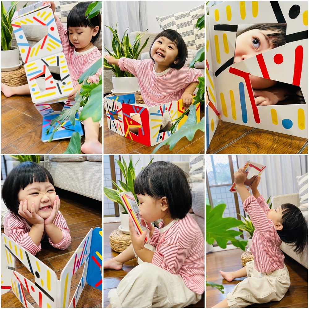 從弟弟一開始對著鏡子癡癡的笑、到姊姊數著各種顏色的球各有幾顆?在每一面找到什麼形狀?可以模仿不同線條的不同動作、將手指從這一頁的三角型穿到下一頁的正方形裡,或是把整本書攤開像城堡一樣把自己圍起來……兩姊弟一起玩、一起笑、一起搶!真的太有趣了!