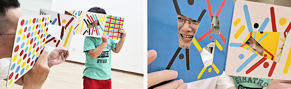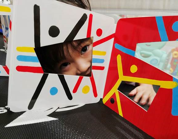 ●臉部器官遊戲:在不同形狀的框框中,露出不同的臉部器官及表情,知知跟爸爸在書的世界玩躲貓貓。