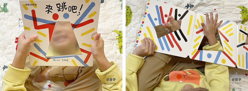 ●鏡子裡的舞者:知知發現鏡中的自己,開始手舉起來看看、腳舉起來看看,放音樂就自己趴在地板看著書本舞動!後來發現書的兩頭都有鏡子,一下看這邊一下看那邊,還可以透過鏤空頁看鏡子……誰說跳舞一定要面對牆上的鏡子,我們趴著也能跳!