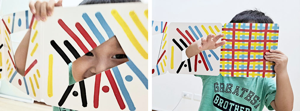 ●不同的視角看世界:雙眼看出去的世界,與有遮蔽所看到的世界,似乎有不同的感受。知知拿著書,看著家裡的各種東西,像是模擬攝影師在尋找各種不同角度的取景。
