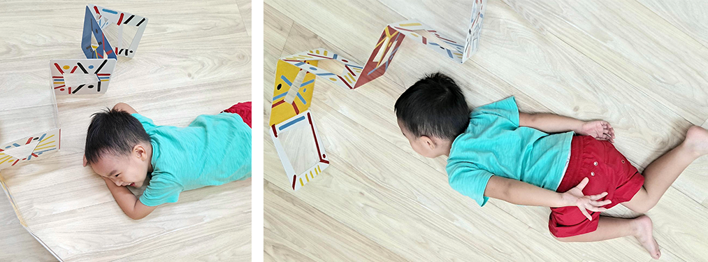 把書摺來摺去,發現不同的圖案與顏色,疊在不同的挖頁設計,就是創意遊戲。也可以藉由異形的挖洞設計,改變眼睛所看到的範圍,玩視野遊戲。還有,孩子軟Q的肢體就是能夠以反人體工學的姿勢,做著各種想完成的動作,腳ㄚ先過去、手腕再過去,最後一起過去,就是穿越遊戲啊。