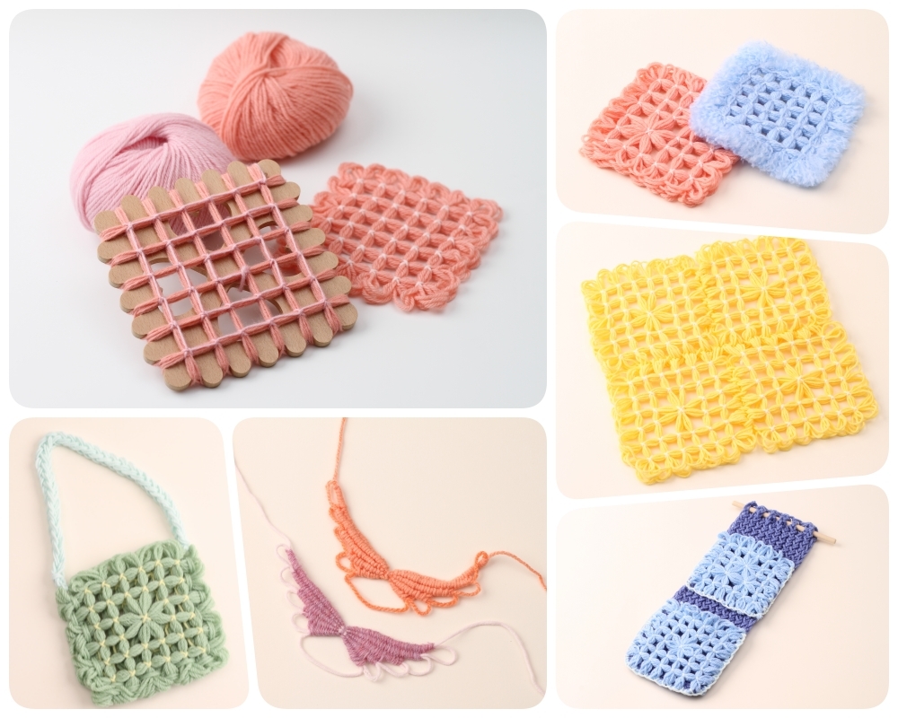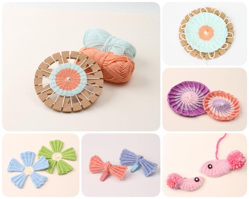 圓形的花花編織器可以編出圓形造型的物品,做出圓墊、花花飾品、小吊飾等。方形的餅乾編織器搭配繞縫,同樣可以創作出方墊、包包與抱枕。產品附上安全彎頭大針眼的手縫針,讓幼兒可以安全接觸基礎縫紉。