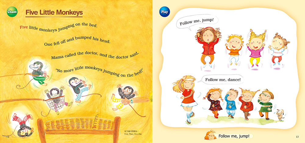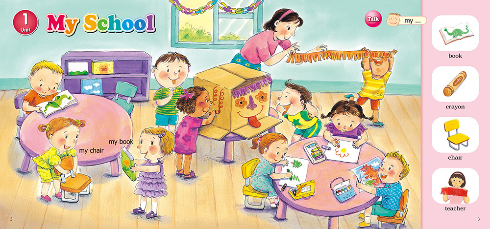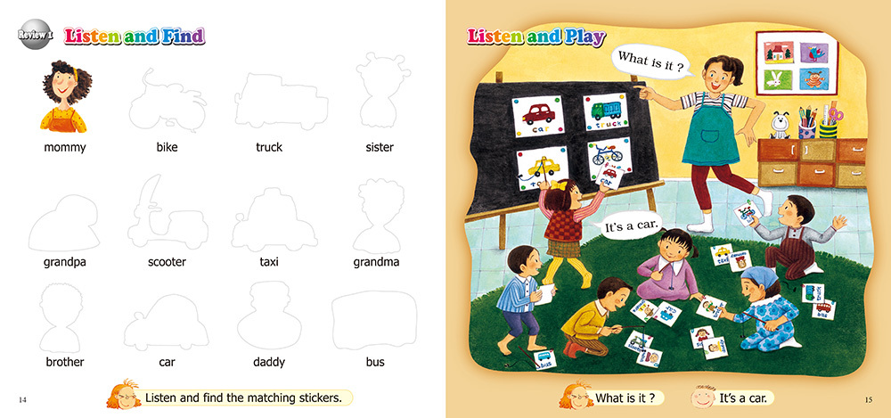 .《Hello》、《Good Morning》貼近孩子生活主題,從自己的身體、家庭、學校,到認識動物、水果、顏色、車子等,學習基本英文名稱和簡單句子。
