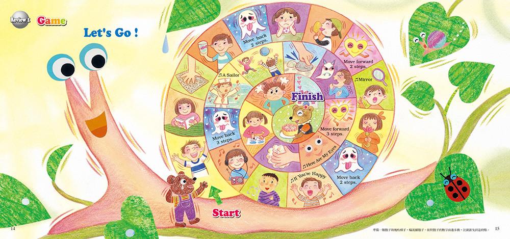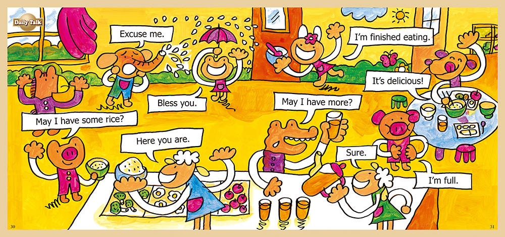 .《How Are You?》、《It’s Delicious》從孩子熟悉的周遭環境開始,自交通工具、場所、天氣、購物、過新年,到情緒表達及身體感官運作,學習用英文句型表達意思。