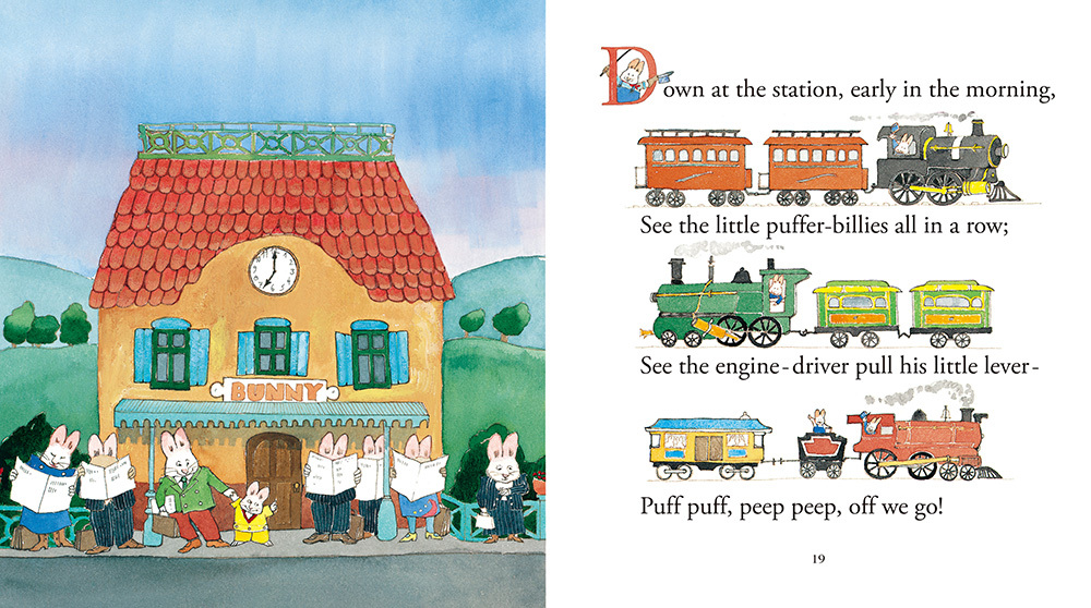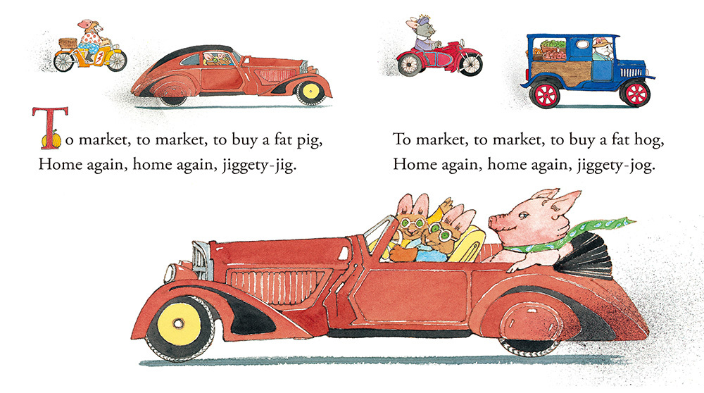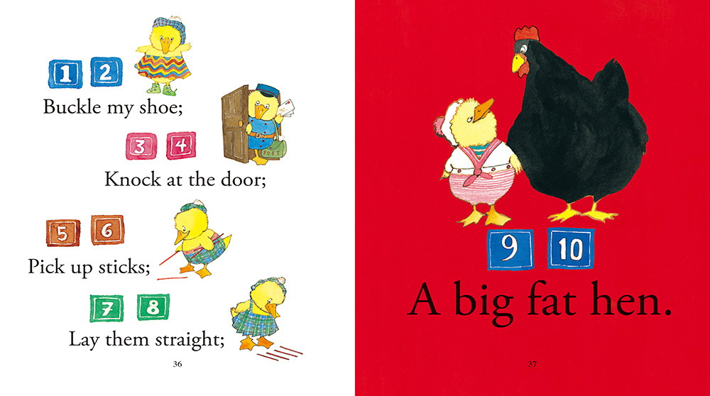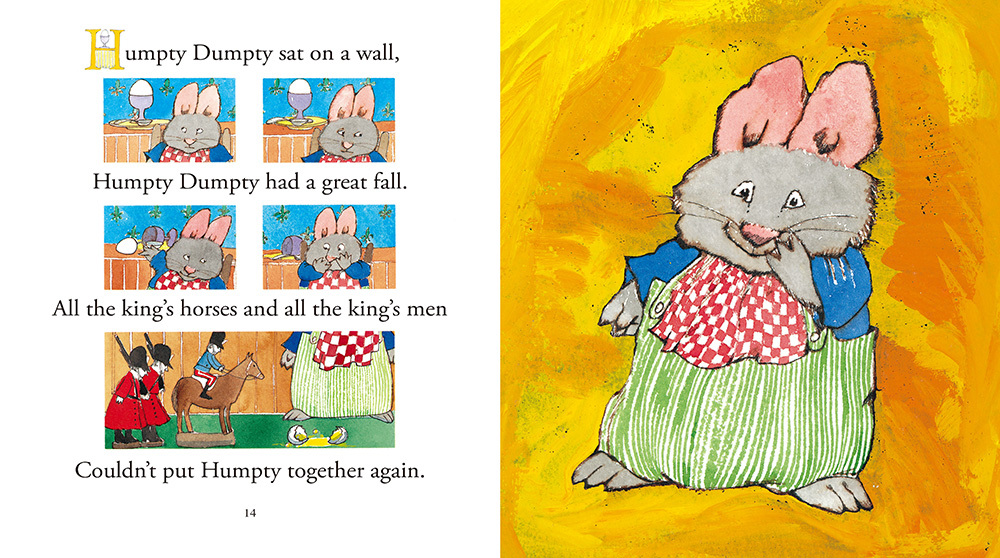 兩百多年來,「鵝媽媽」在一代一代的傳誦、詠唱當中,很多不合時宜的東西自然的、慢慢的被淨化和增改,因此成就了它能長保活力、歷久而彌新的特質,從1744 年第一本「鵝媽媽」的兒歌集問世以來,每個時代最優秀的畫者都樂意為它配圖,為它注入新的生命。而在眾多形狀、大小不一的版式中,Walker 出版社出版的《My Very First Mother Goose》和《Here Comes Mother Goose》,無疑是翹楚中的翹楚了。這兩本書的編者Iona Opie 女士和她先生畢生致力於採擷、整理及研究英國的童謠和民間傳說,被公認是這個領域的權威,而畫者則是赫赫有名的露斯瑪麗.威爾斯(Rosemary Wells)。威爾斯女士筆下的動物角色,個個都個性鮮明,如:和藹可親的兔媽媽、忠心耿耿的狗兒、俏皮賣乖的小鴨子、喜歡冒險的貓咪⋯⋯在溫馨的氛圍中,這些動物活潑、逗趣的演出,精準的將「鵝媽媽」中單純的喜悅和戲而不謔的幽默完全表現出來了。
