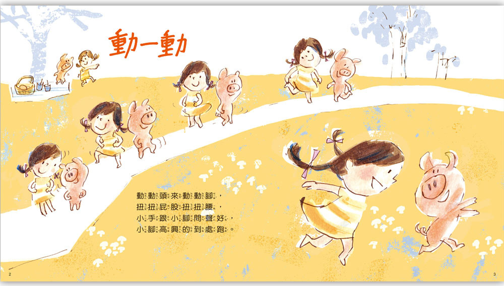 〈動一動〉動哪裡?點頭、點腳,扭腰、扭屁股,再小手碰小腳。暖身夠了,接下來,就是你追我、我追你,開心的跑……