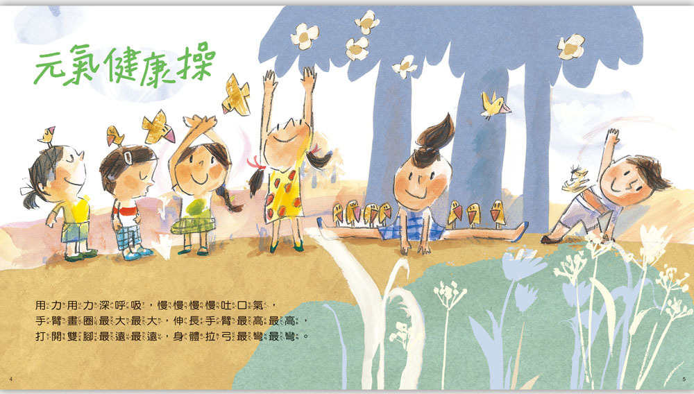這本《1234,動動體操》,是一個邀請孩子開心唱唱跳跳、玩遊戲的請帖。隨著輕快活潑的音樂節奏,讓身體從頭動到腳;跟著口令,做元氣健康操喚醒一天的活力;學機器人走路行進再沒電倒下,惹得自己哈哈大笑;找好朋友,圍個大圓圈轉圈跳舞;或是在追趕跑跳中,追球、搶球,看誰勝利……這些律動遊戲,沒有標準的動作規範,就是自由的舞動、盡情的玩耍,享受自己和身體對話的快樂。遊戲鋪排,有孩子可以自己玩、雙人玩、多人玩;動作設計由淺入深,滿足幼兒園新課綱在身體動作與健康領域的各項技能,包含穩定性動作的扭轉、彎曲、伸展、擺動;移動性動作的走跑跳爬;還設計了操作性動作,讓孩子運用球,玩投擲、拋接、高踢,玩出身體的無限體能!