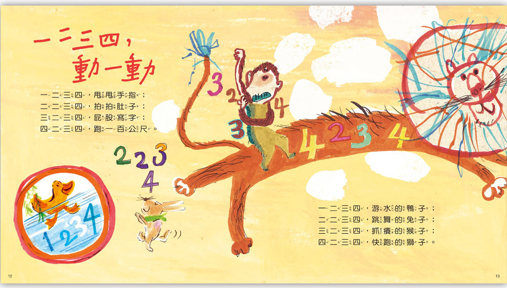 〈一二三四,動一動〉屁股寫字,怎麼寫,寫什麼?好吧!我扭扭屁股寫給你看!學獅子快跑,怎麼跑,跑多快?好吧!我學獅子快跑一圈給你看!