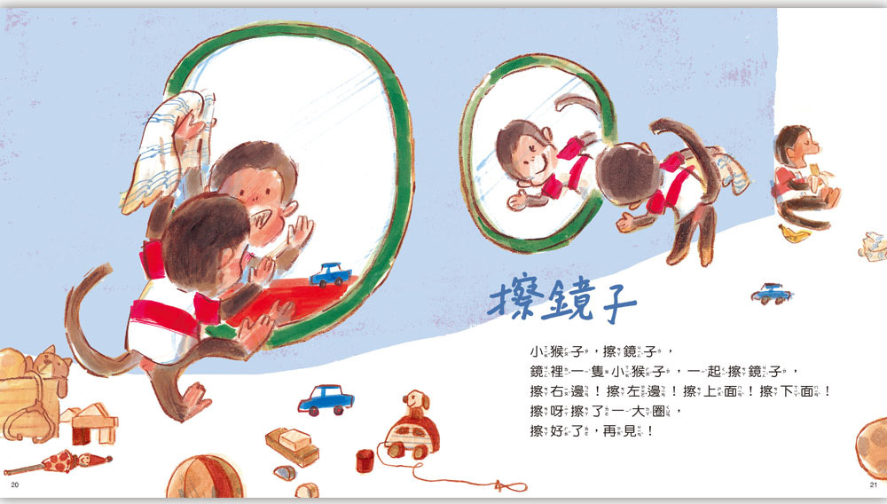 〈擦鏡子〉你當小猴子擦鏡子,我當鏡裡的小猴子學你擦鏡子;你做什麼,我就做什麼,直到你說擦好了為止!哈~快來玩模仿的跟屁蟲遊戲。
